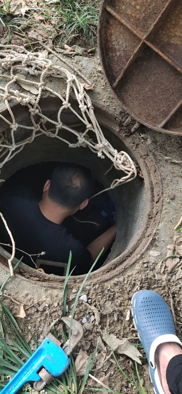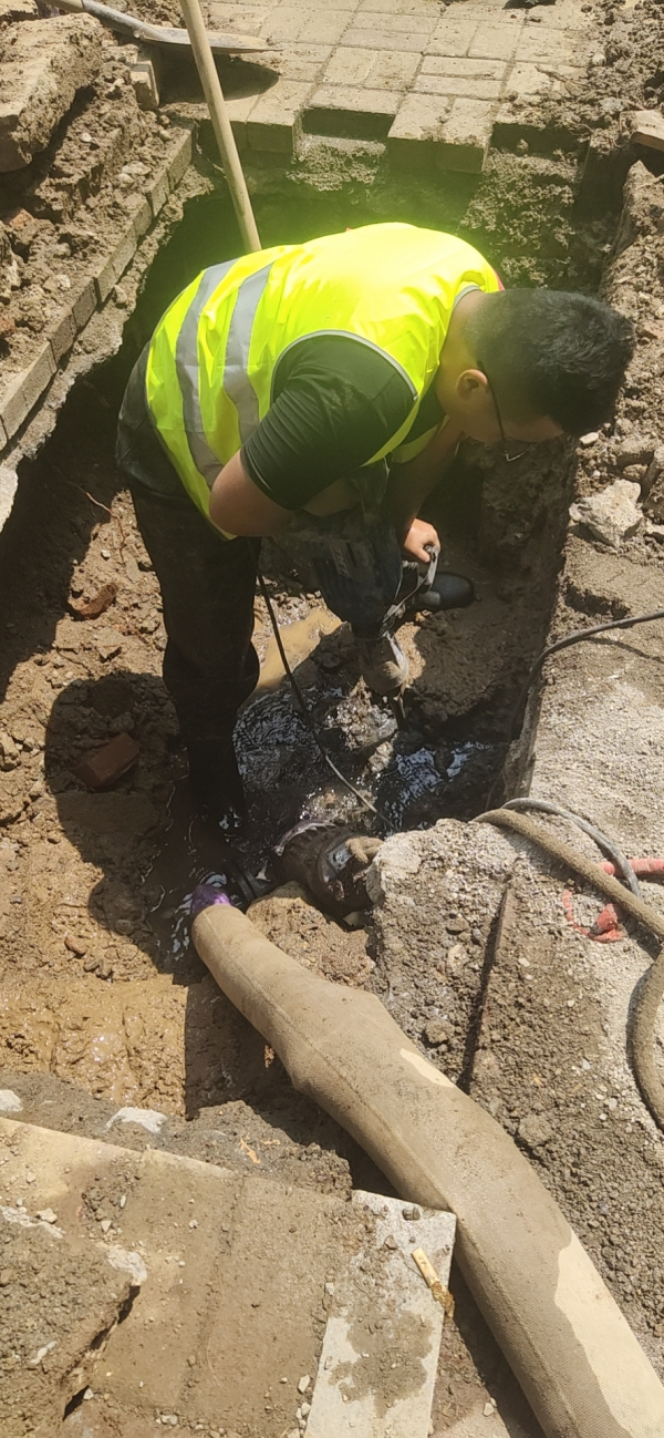 8月7日一早,孟隊(duì)帶領(lǐng)搶修隊(duì)員、檢漏隊(duì)員進(jìn)入福寧小區(qū)。第一步確定有無明漏,先檢查用戶水表,排查結(jié)束未發(fā)現(xiàn)漏水。第二步打開小區(qū)所有井蓋逐一排查,發(fā)現(xiàn)有流水的窨井,搶修隊(duì)員下到井室取水樣,分析、檢測(cè)、區(qū)別、排查,一個(gè)不是再到下一個(gè)井室,從早上排查到晚上,排查二十幾個(gè)后,終于在福寧小區(qū)8號(hào)樓前井室測(cè)試是自來水,至此確定附近有暗漏,這時(shí)指針已經(jīng)是22:47分。第三步檢漏隊(duì)員使用專用“武器”。8月8日00:10分,精準(zhǔn)定位暗漏點(diǎn)位置,確定該管線是de110PE管漏水。為了不打擾居民夜間休息,定于8月8日8:30分施工。施工隊(duì)按照搶修方案快速有序、高效完成搶修任務(wù),于15:02分一次送水成功,福寧小區(qū)壓力恢復(fù)正常。